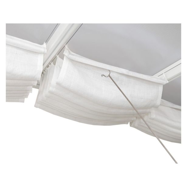 Uporaba za nadstrešek Sierra dim. 3×3,05m. Priložena je x1290cm x 54cm senčna zavesa, x2 kovinska palica 19mm X 60cm, pobarvana v belo za vsako enoto zavese, x20 plastičnih kavljev, x2 komplet nosilca za kabel za zavese + 320cm X 2mm kovinski kabel, prevlečen s PVC. Pranje v hladnem stroju, brez klorovega belila, sušenje na perilu Za izbirno senco v kombinaciji s pokrivalom za vašo teraso. Bele je barve.