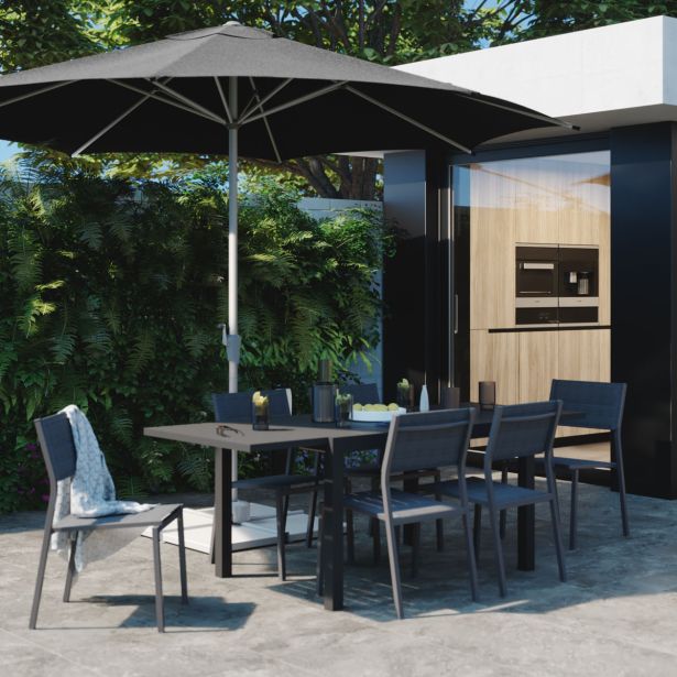 Dežnik Aura ne le da vas ščiti pred soncem, temveč prinaša tudi sodoben videz vaši terasi ali vrtu. Njegova osemkotna platna in antracitna barva modernizirata vaš prostor, obenem pa zagotavljajo boljšo zaščito pred svetlobo kot lažji dežniki. Za popoln in harmoničen izgled ga kombinirajte z jedilno serijo Lyra II v temno sivi barvi.
