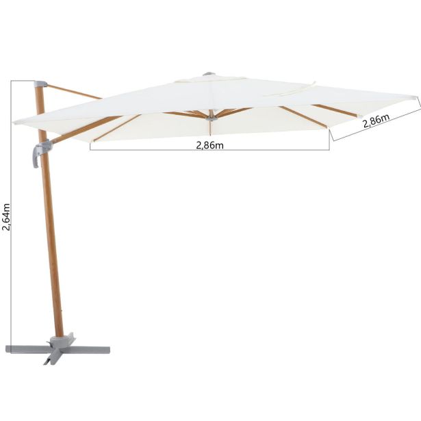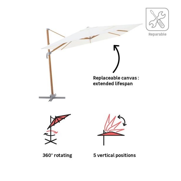 Tkanina dežnika je iz poliestra, ki je posebej odporen na UV žarke, zato se verjetno ne bo obarvala. Dežnik je zelo odporen na veter, vendar ga je priporočljivo obtežiti s težo 120 kg (prodaja se ločeno). Pozimi ga zaščitite s primerno prevleko. Enostaven je za vzdrževanje, saj aluminijasto steblo in jekleni žarki ter križni podstavek zahtevajo le čiščenje z vlažno krpo in nevtralnim sredstvom. Tkanino je mogoče zamenjati in prilagoditi vašim željam, da podaljšate življenjsko dobo dežnika.
