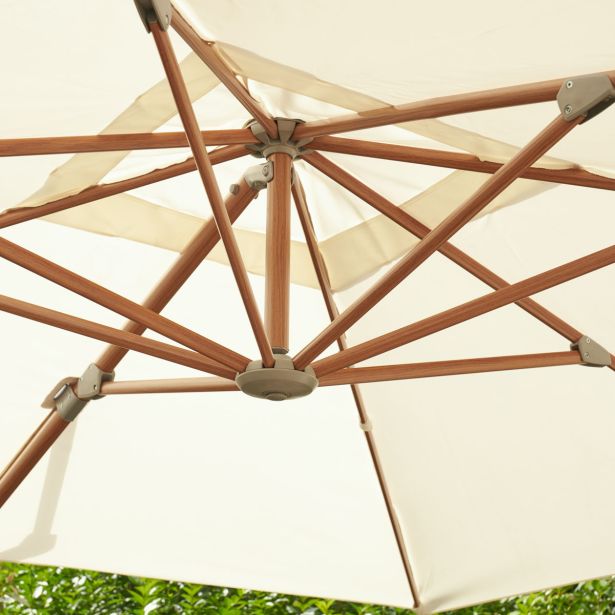Dežnik Agora ne le ščiti pred soncem, ampak tudi prinaša naravni videz vaši terasi ali vrtu. Aluminijast steber z lesnim učinkom in bela tkanina ustvarita topel duh, ki se popolnoma ujema z naravnimi lesnimi serijami, kot sta seriji Oasis in Aurora.