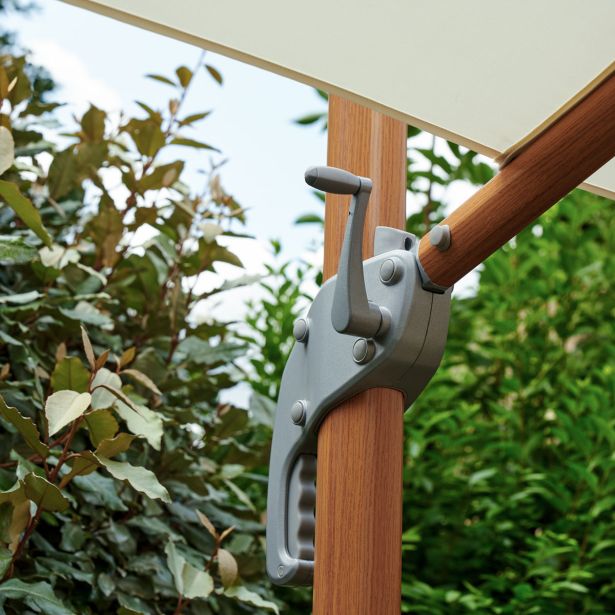 Dežnik se enostavno zapre s stransko ročico in vratom. Njegova aluminijasta struktura in jekleni križni podstavek sta odporna proti vlagi in koroziji.