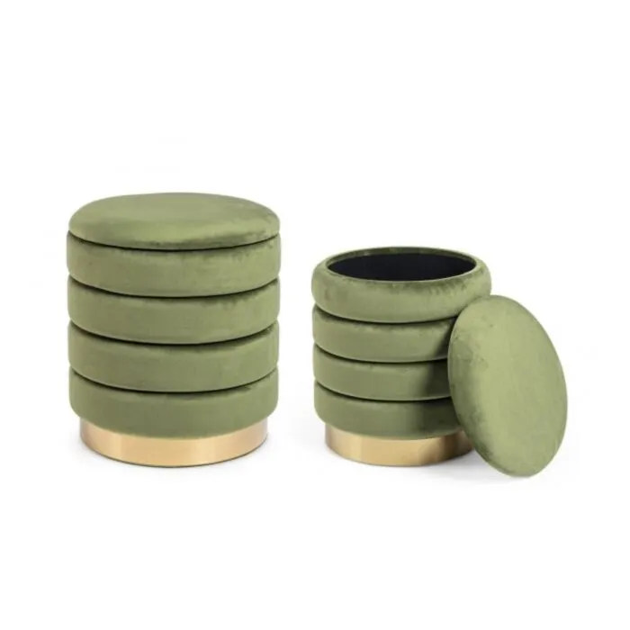 Set 2 taburejev DARINA zelena ima strukturo iz MDF-ja in vezane plošče, prevleko ima iz poliestra ki oddaja učinek žameta. Dno je zlatne barve.