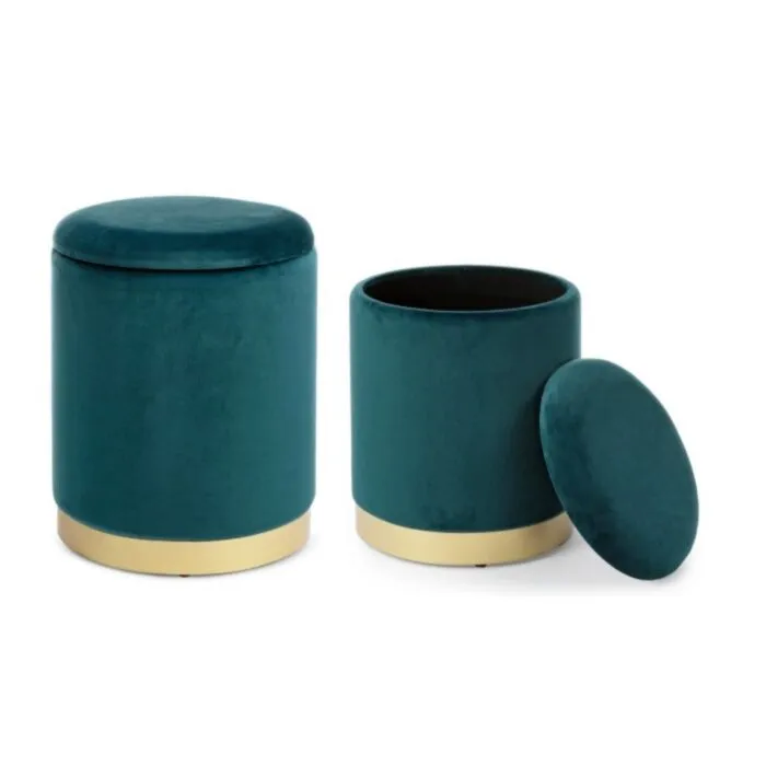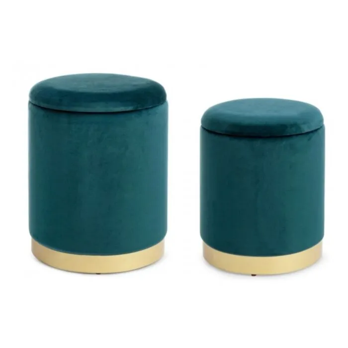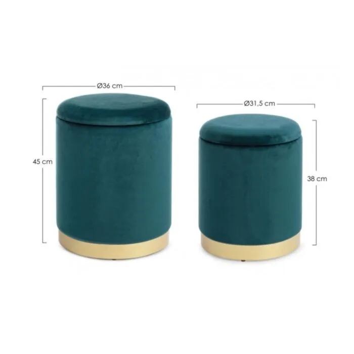 Set 2 taburejev POLINA modra ima strukturo iz MDF-ja, prevleka je iz poliestra ki oddaja žametni učinek. Dno krasi zlati obroček iz metala.
