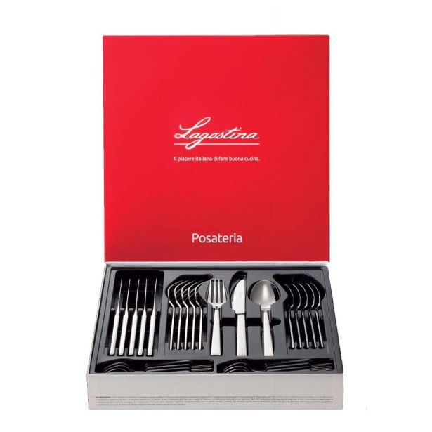 24-delni jedilni pribor GIADA, znane italijanske blagovne znamke Lagostina, je izdelan iz nerjavečega 18/10 z zrcalno poliranim zaključkom in je popoln dodatek vaše lepo pogrnjene mize. Pribor debeline 3 – 5 mm, je sinonim za prefinjenost in kvaliteto. V kompletu je 6 vilic, 6 žlic, 6 žagastih nožev za zrezke in 6 čajnih žličk (za 6 oseb). Dovoljeno pomivanje v pomivalnem stroju. Priporočamo, da po končanem pomivanju rezilo noža prebrišete na suho.