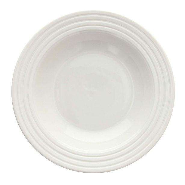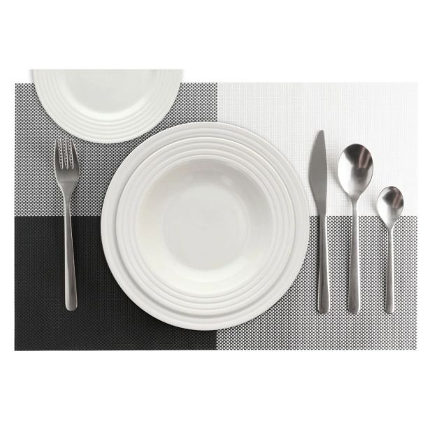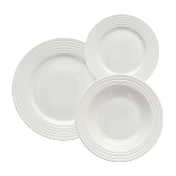 Garnitura krožnikov Tognana Polis RIngf je 18-delni set visokokakovostih krožnikov iz prvovrstnega porcelana.Okrašena s 4 reliefnimi krogi na krilu krožnika.
