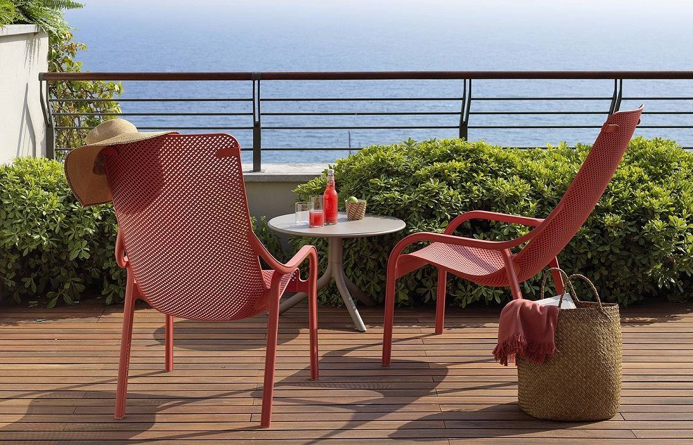 Vrtni set NARDI NET LOUNGE za opremo vaše terase. Set sestavljata dva vrtna počivalnika v rdeči barvi in mizica SPRITZ v rjavi barvi.