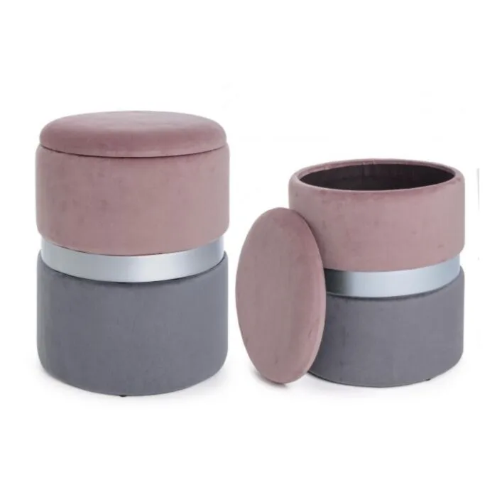 Set2 taburejev POLINA sivo-roza ima okvir iz MDF-ja in vezanega lesa, pokrov v obročku je v jekleno zlati barvi. Narejen je iz poliestra ki oddaja učinek žameta.