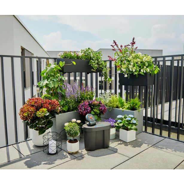 Set GARDENA AquaBloom z zalogovnikom vode poskrbi za zanesljivo in enakomerno zalivanje do 20 rastlin na balkonu ali terasi, ko ste na dopustu ali preobremenjeni.