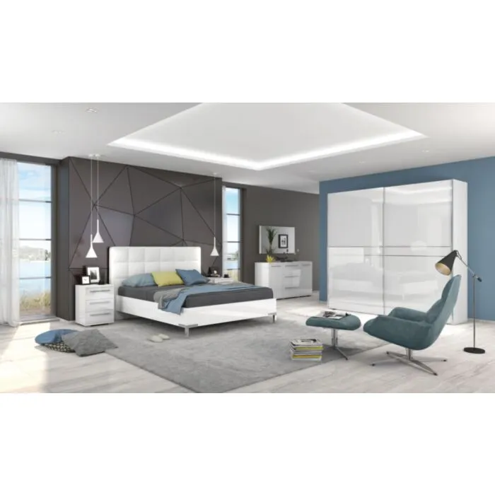 Kompletna spalnica KAVAL 1 bo poskrbela za vaš počitek in mir, obenem pa ima veliko prostora za shranjevanje oblačil v garderobni omari za dve osebi. V kompletu dobite