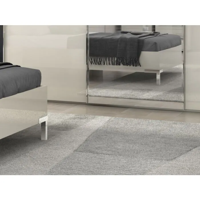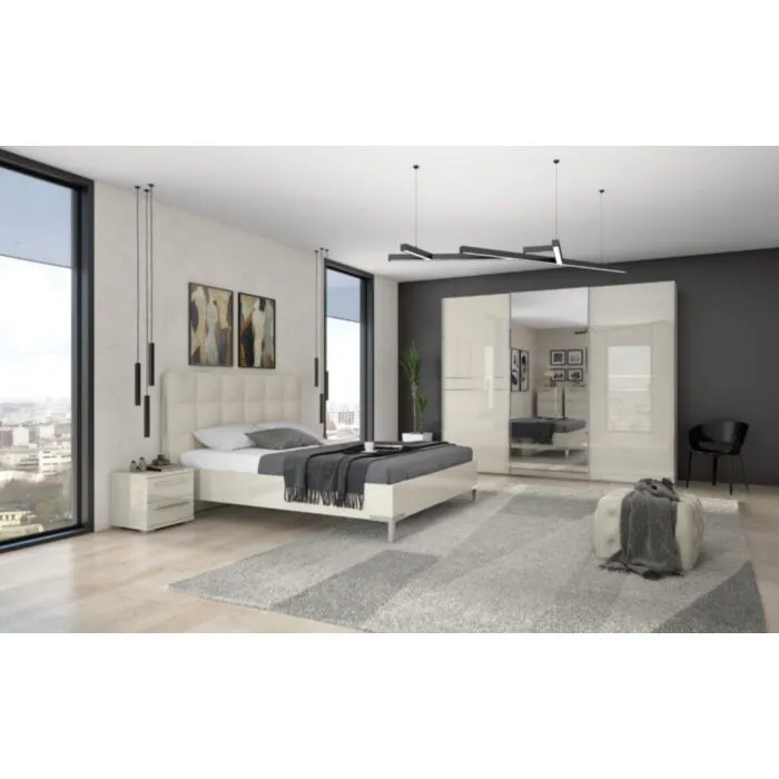 posteljo, dve nočni omarici in garderobno omaro. Omara ima mehko zapiranje. Ima tri krila, devet polic in tri palice za obešanje oblačil. Komplet ne vsebuje vzmetnice.