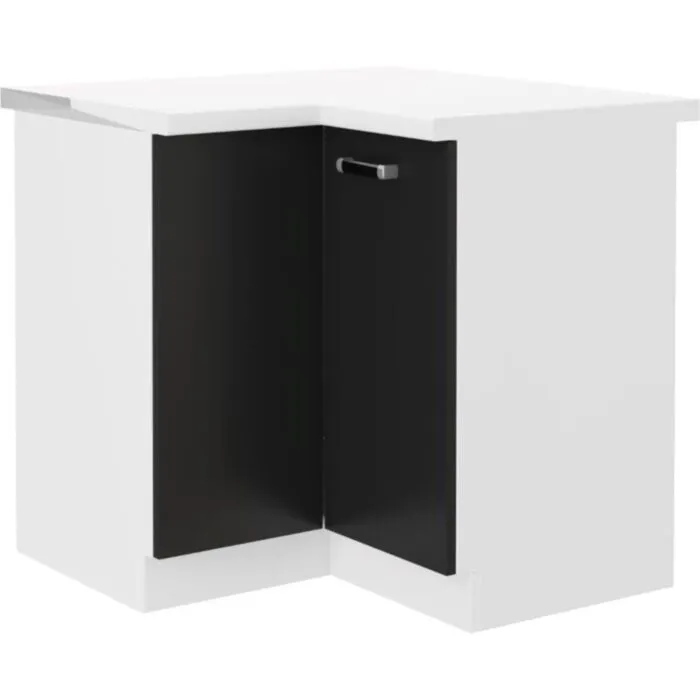 Spodnja kotna omara DELTA 89 x 89D je narejena iz laminirane plošče, debeline 16 mm, robovi so iz ABS 1 mm. Ročaj je v srebrni barvi. Kuhinjski element je na voljo v črno-beli barvi.