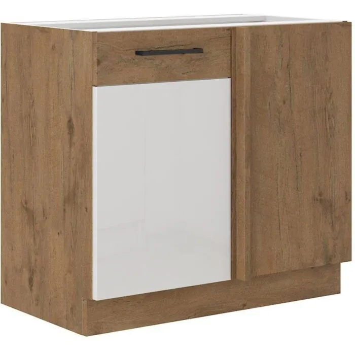 Spodnja kotna omara PARIZ GLOS 105D je sestavljena iz fronte iz laminirane plošče, debeline 16 mm, robovi so iz ABS 1 mm, ročaji so iz plastike. Korpus je iz laminirane plošče in ima melaminske obrobe. Kuhinjski element je na voljo v barvi belega visokega sijaja s hrastom in ima mehko zapiranje.