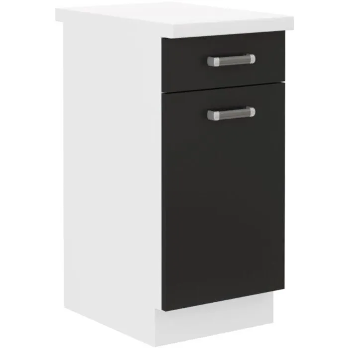 Spodnja omara DELTA 40D 1S je narejena iz laminirane plošče, debeline 16 mm, robovi so iz ABS 1 mm. Ročaji so v srebrni barvi. Kuhinjski element je na voljo v črno-beli barvi.