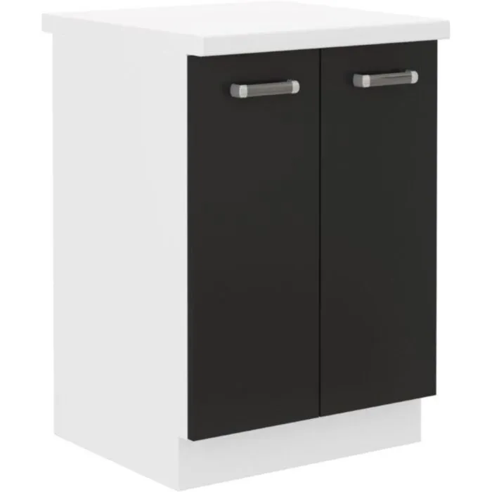 Spodnja omara DELTA 60D je narejena iz laminirane plošče, debeline 16 mm, robovi so iz ABS 1 mm, ročaji so iz plastike. Kuhinjski element je na voljo v črno-beli barvni kombinaciji.