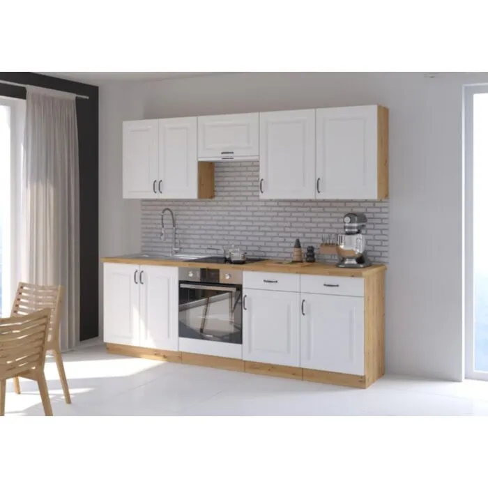 Spodnja omara STIL 50D je sestavljena iz vrat in predalnika iz MDF plošče, debeline 16 mm, robovi so iz ABS 1 mm, ročaji pa so iz plastike v črni barvi. Korpus je narejen iz laminirane plošče, debeline 16 mm, robovi so iz melamina. Kuhinjski element je na voljo v barvi hrasta z belo mat barvo in ima mehko zapiranje.