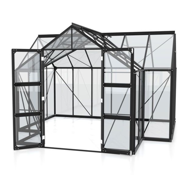 Okvir rastlinjaka je izdelan iz aluminijastih profilov, ki so odporni proti koroziji in vremenskim vplivom. Rastlinjak je v celoti zastekljen z visokokakovostnim varnostnim steklom debeline 3 mm. To kristalno čisto steklo prepušča veliko dnevne svetlobe v hišo in vašim rastlinam zagotavlja optimalne pogoje za rast.