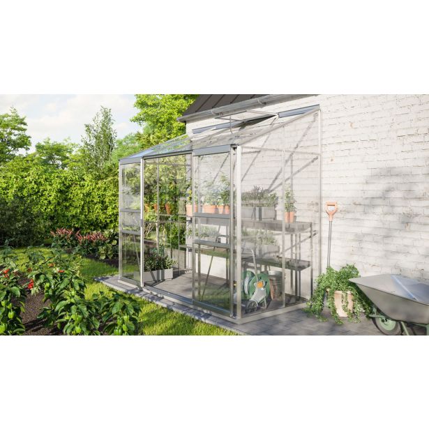 Prislonjeni komplet za rastlinjak iz anodiziranih aluminijastih profilov in zasteklitve s približno 3 mm debelim, kristalno čistim varnostnim steklom (ESG). Artikla ni mogoče postaviti samostojno.
