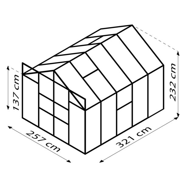 Komplet za rastlinjake iz eloksiranih aluminijastih profilov in zasteklitev iz kaljenega varnostnega stekla debeline približno 3 mm, kristalno čista.