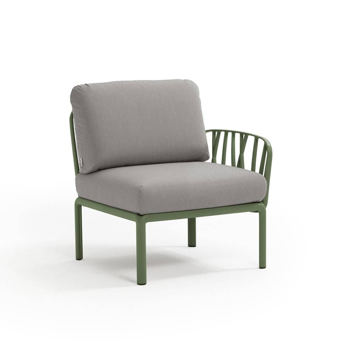 Stranski element KOMODO, za sestavo svoje poljubne garniture ter za poljubno kombinacijo elementov iz serije KOMODO. Barva ogrodja: agave s poljubno barvo blazine. Naslon za roko se lahko montira levo ali desno.