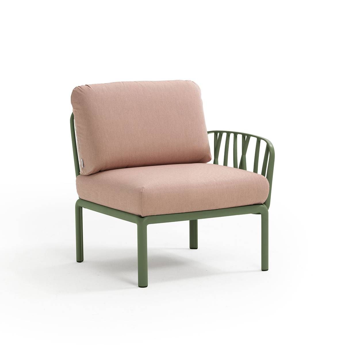 Stranski element KOMODO, za sestavo svoje poljubne garniture ter za poljubno kombinacijo elementov iz serije KOMODO. Barva ogrodja: agave s poljubno barvo blazine. Naslon za roko se lahko montira levo ali desno.