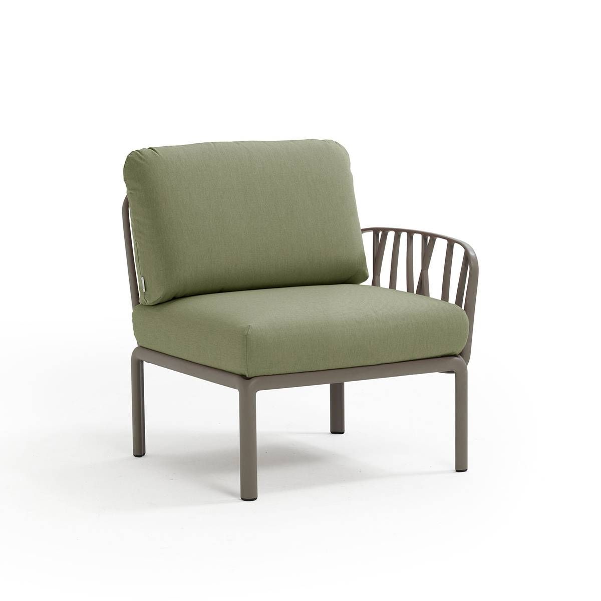 Stranski element KOMODO, za sestavo svoje poljubne garniture ter za poljubno kombinacijo elementov iz serije KOMODO. Barva ogrodja: tortora s poljubno barvo blazine. Naslon za roko se lahko montira levo ali desno.