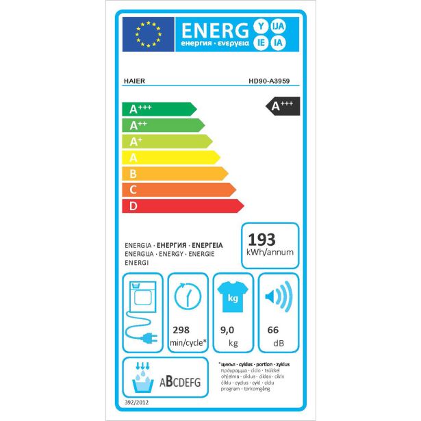 Sušilni stroj Haier HD90-A3959 I-Pro Serije 5 je prostostoječi inverterski sušilni stroj s toplotno črpalko, ki ima prostora za 9 kg oblačil, ima 11 prednastavljenih programov sušenja.