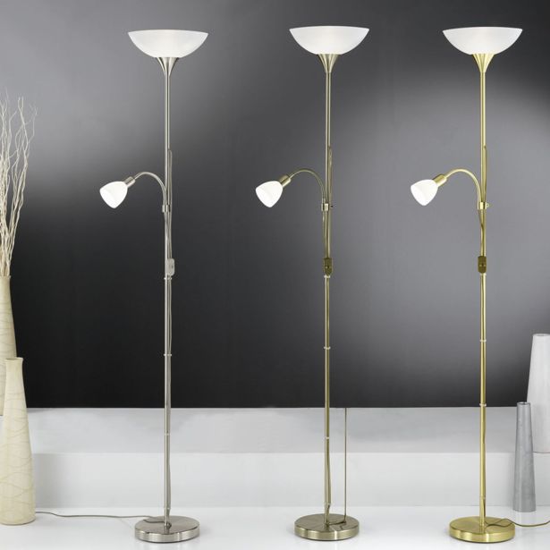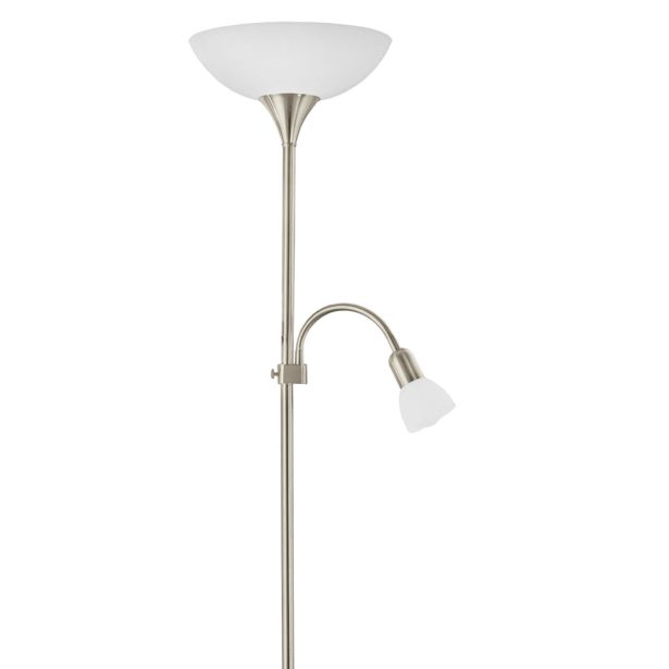 Moč žarnice 100 W, vznožek E27, z bralno lučko nastavljivo po višini z močjo 40 W in z vznožkom E14, iz mat ponikljane kovine, belo satinirano steklo.