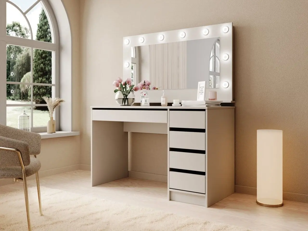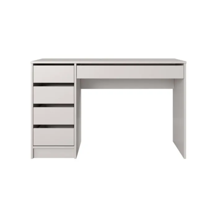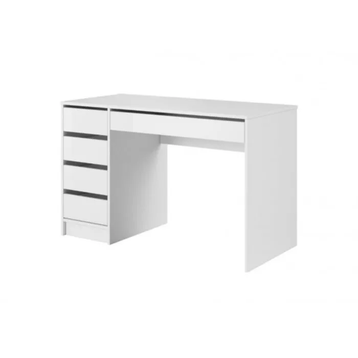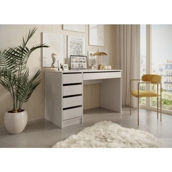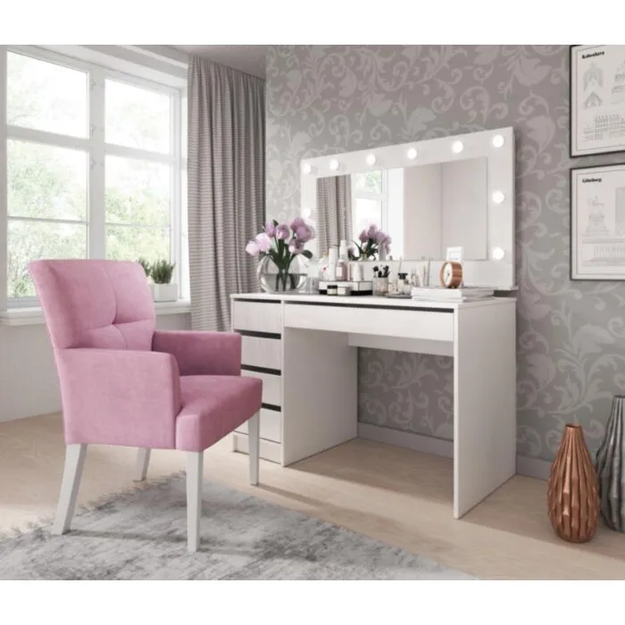 Moderna toaletna miza TEREZA 2 je funkcionalna in elegantna. Komplet je sestavljen iz: elegantne mize z štirimi predali ob strani ter velikim predalom pod mizno ploščo ter ogledala z LED osvetlitvijo. Mizo lahko uporabljaste v več namenov, da krasi vaš kozmetični, frizerski salon, vašo spalnico, poseben kotiček ali preprosto, kot pisalno mizo. Praktični predali vam omogočajo priročno organizacijo prostora in enostavno shranjevanje.