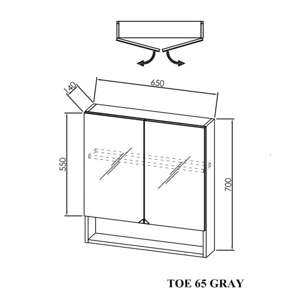 Zrcalna omarica EVELIN TOE 65 znamke Kolpa san, predstavlja elegantno in funkcionalno rešitev za vašo kopalnico. Izdelana je iz vzdržljivega materiala LTD in je na voljo v privlačni sivi barvi. Z dvokrilnimi vrati omogoča enostaven dostop do notranjosti, kjer boste našli praktično odprt regalni prostor z dvema policama, namenjen shranjevanju kopalniških dodatkov. Pod ogledalom pa se nahaja tudi polica, katera je namenjena za hitro odlaganje kozmetičnih pripomočkov oziroma dekorativnih izdelkov,