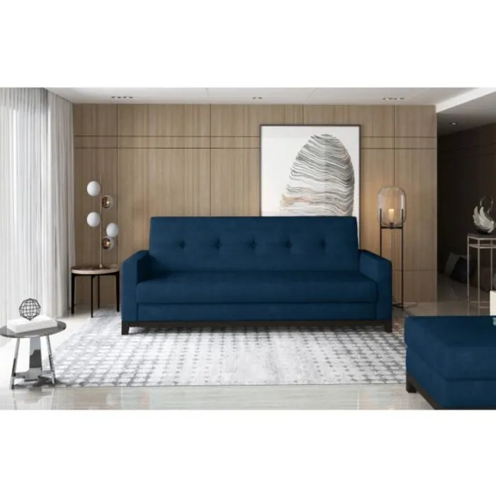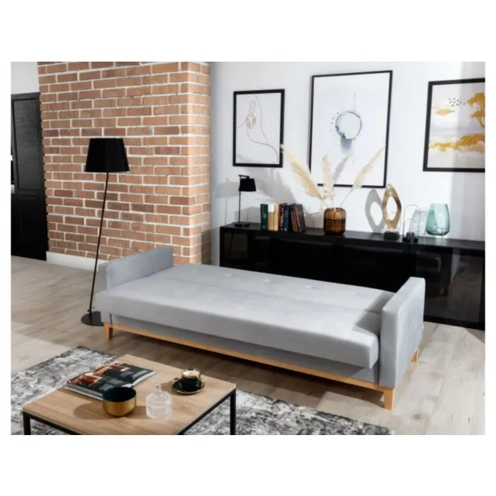 K udobju prispevajo tudi mehki nasloni za roke. Konstrukcijo nosijo in bogatijo lesene noge, izdelane iz masivnega lesa v barvi temno rjave – oreh. Trosed ima spalno funkcijo ter posodo za posteljnino.