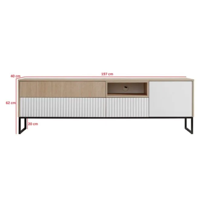 TV omarica ZOELA je moderno oblikovana in elegantnega videza. Brez ročajev, odpiranje po sistemu push to open. V beli mat barvi s kombinacijo lesa. Izdelana v EU iz laminirane plošče debeline 16mm in ABS robovi. Nogice ima metalne črne barve.