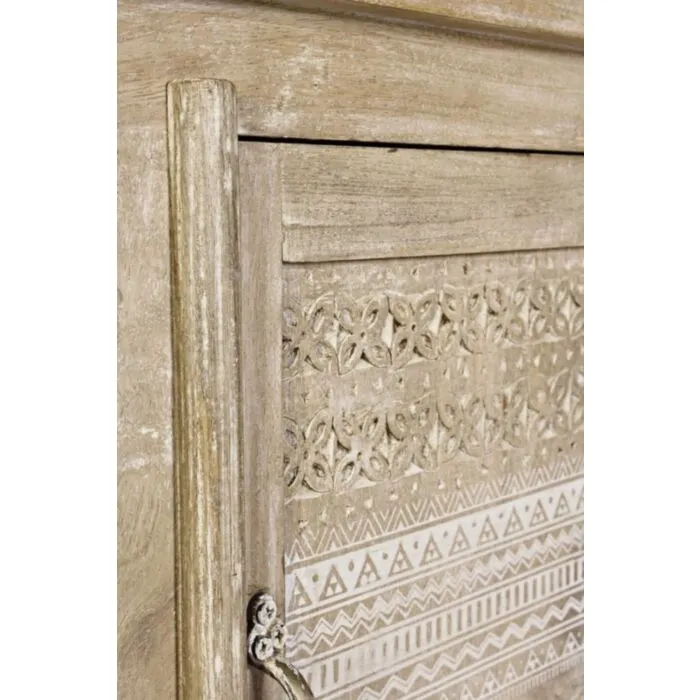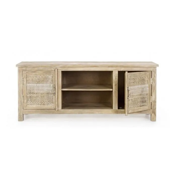TV regal 2A MAYRA ima okvir iz lesa z ročno izrezanimi okraski, zadnje strani so iz MDF-ja. Imajo medeninaste ročaje.