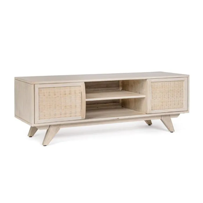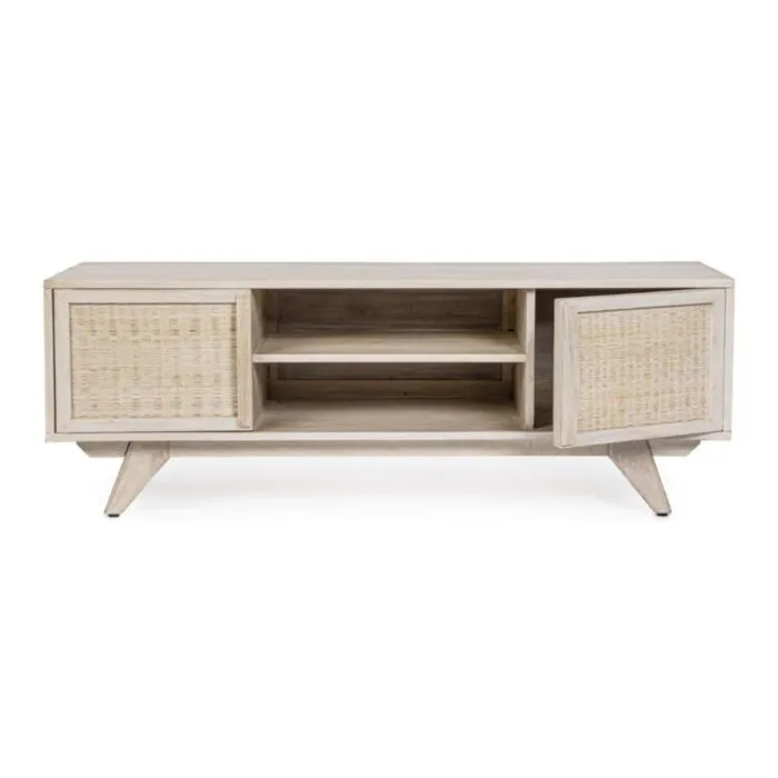 TV regal 2A SAHANA, je izdelan iz visokokakovostnega mangovega lesa in MDF-ja, kar mu daje trpežnost in eleganten videz. Prednja vrata so izdelana iz ratana, kar doda naraven in teksturiran element, ki ustvarja topel in sodoben videz.