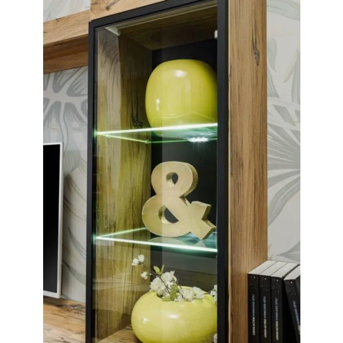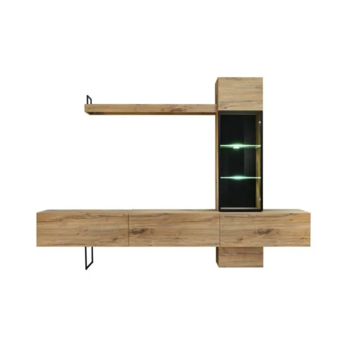 TV regal ALIZA je narejen iz kvalitetne laminirane plošče s sistemom push- click za odpiranje. Sestavljen je iz treh ločenih visečih omaric. Zgoraj vsebuje polico, na desni strani visoko omarico, ki vsebje steklene poličke ter spodaj iz treh enako dolgih omaric, ki se odpirajo navzdol. Na levi strani vsebuje tudi črno kovinsko nogo.