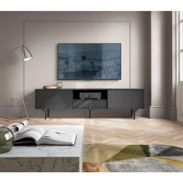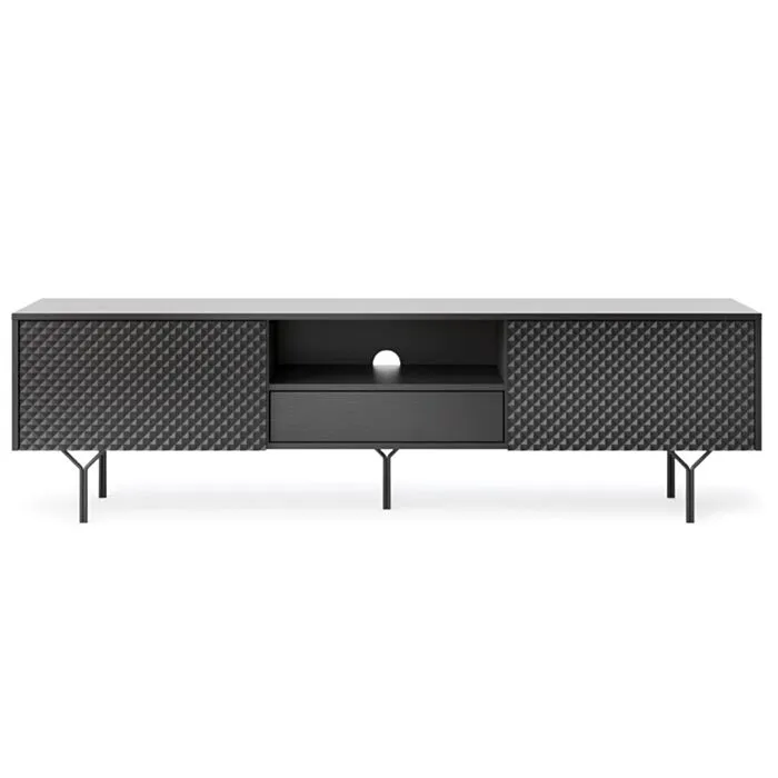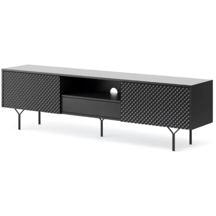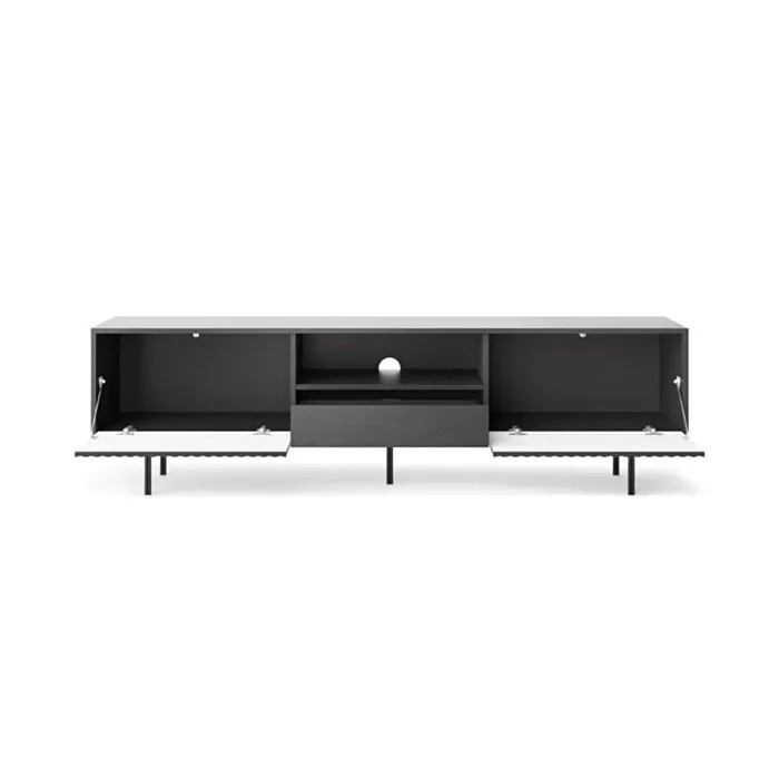 TV regal AVER je narejen iz kvalitetne laminirane plošče s ABS robovi. Noge so iz črnega jekla, omarice se odpirajo s sistemom push to open.