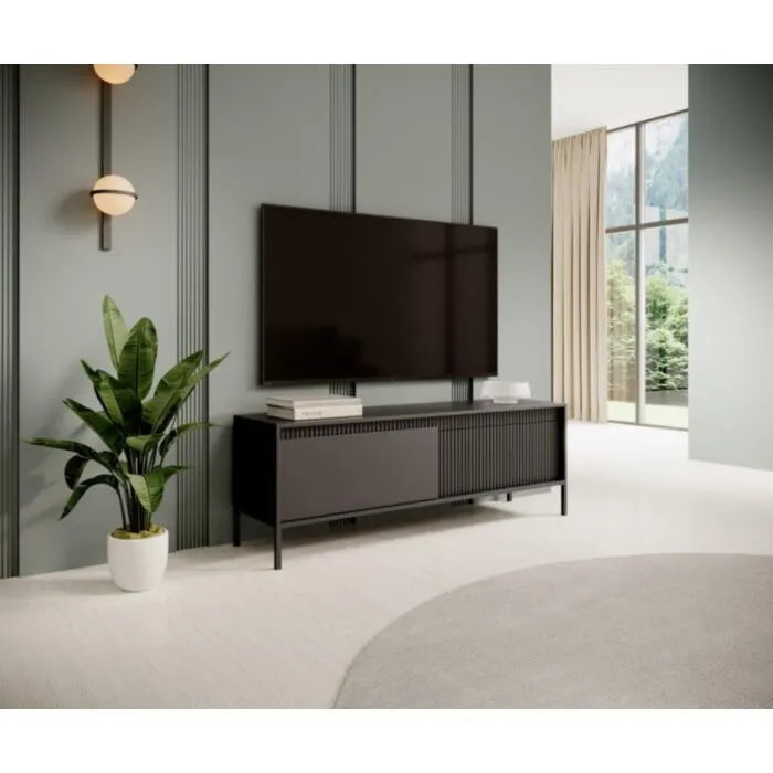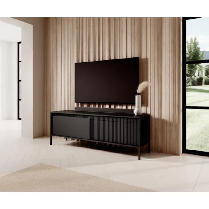 TV regal FIFIJA 153, je eleganten kos pohištva, ki popestri vaš prostor s svojim luksuznim dizajnom. Narejen je iz kakovostnih materialov v črni barvi. Izdelan je iz MDF-ja in ABS robov. Ima kovinske nogice v črni barvi. Ima mehko zapiranje. Ima poseben rebrasti dizajn, ki popestri vaš prostor.