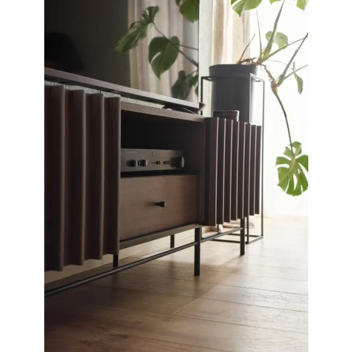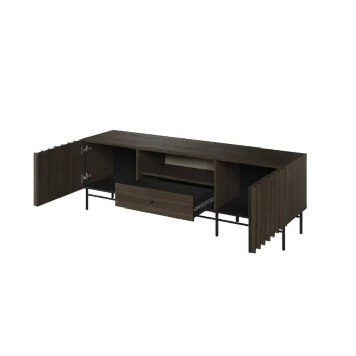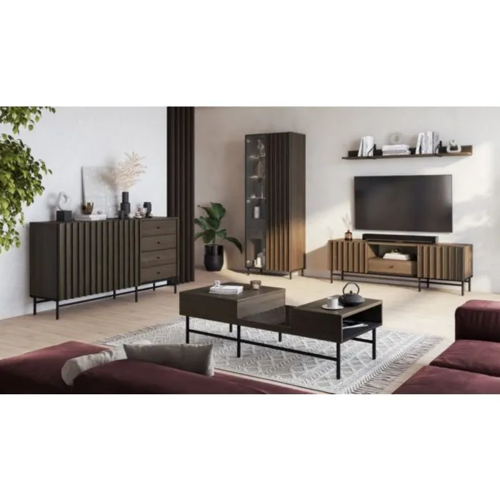 TV regal HORIZON je moderen kos pohištva. Ni le praktična, temveč tudi dekorativna in elegantna. Zaradi svoje razporeditve se poda v vsak dnevni prostor. Narejena je iz laminirane plošče debeline 16 mm in 22 mm v rjavi barvi s kombinacijo črnega odtenka. Ima ABS robove, ki zagotavljajo večjo odpornost proti udarcem, vlagi in obrabi ter podaljšujejo njeno življenjsko dobo.