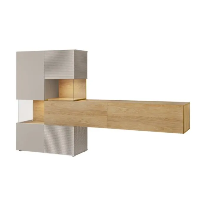 Del komode je steklen, kar doda pridih elegance in modernosti, kar tvori popolno ozadje za vašo televizijo in ostale elektronske naprave. Ta TV regal je odlična izbira za vsak dom, saj nudi dovolj prostora za shranjevanje, hkrati pa doda stil in funkcionalnost vašemu prostoru.