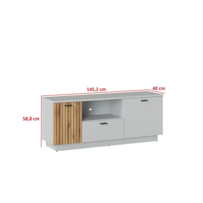 TV regal VIVIJA 3v barvni kombinaciji hrasta in sive bo vašemu prostoru dodal toplino in eleganco. Izdelan je iz kakovostne iverne plošče debeline 16 mm in 22 mm, s trpežnimi ABS robovi in MDF elementi, kar mu daje dolgotrajno vzdržljivost.