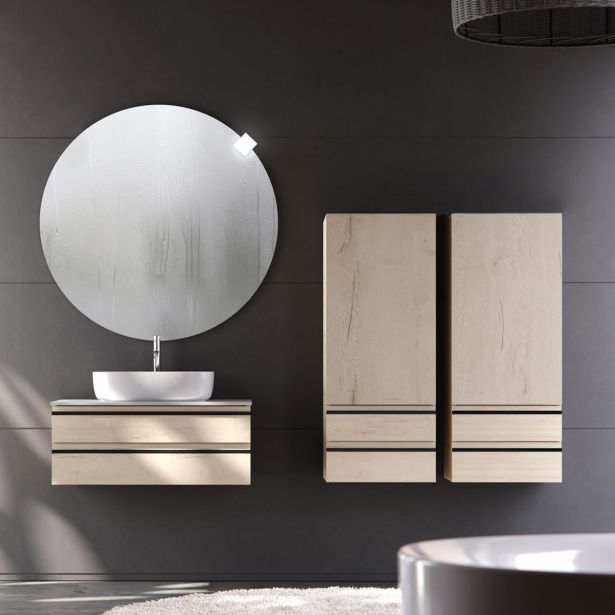 Opremljena s prostornima kovinskima predaloma, elegantnimi črnimi ročaji ter sistemom tihega zapiranja, omogoča organizirano in udobno shranjevanje v kopalnici. Vključuje vgrajen sifon brez odtoka umivalnika.