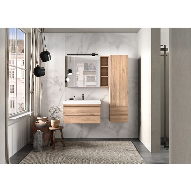 Kopalniška omarica z umivalnikom Kolpa san OUN 80 DC iz linije Naomi je izdelana v barvi naravnega lesa. Kopalniška omarica se montira na steno. Dimenzija visoke kopalniške omarice ( Š x V x G) 800 x 435+60 x 450 mm.