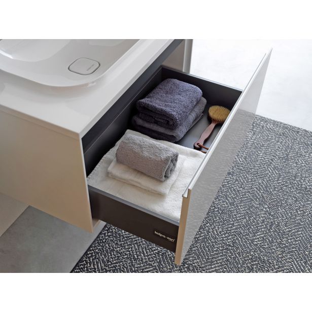 Vgrajeni aluminijasti ročaji dodajajo sodoben dotik, medtem ko mehko zapiranje na dotik zagotavlja nežno in tiho zapiranje predala, kar povečuje udobje in energijsko učinkovitost. Kovinski predal pa prinaša dodaten prostor za shranjevanje in organizacijo kopalniških potrebščin.