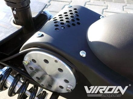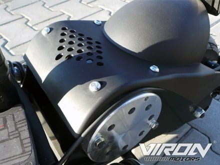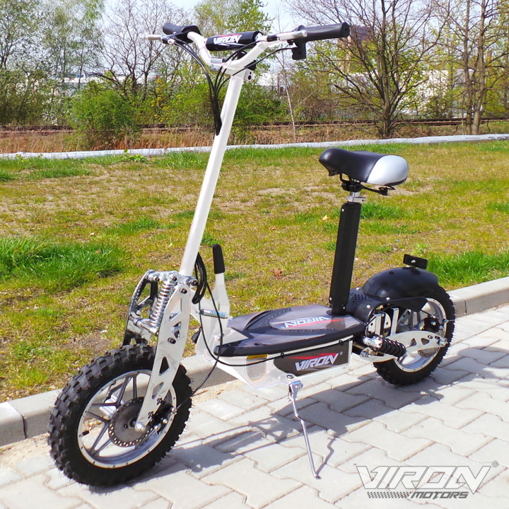Električni skuter – “VIRON” je opremljen z močnim 1000 W električnim motorjem. 36-voltni baterijski paket, sestavljen iz treh 12-voltnih baterij, vsaka po 12 Ah, omogoča skuterju doseg do 30 kilometrov s samo enim polnjenjem baterije, odvisno od terena. Baterijo lahko polnite s polnilnikom, ki je priložen v obsegu dobave. Čas polnjenja je približno 6-7 ur.