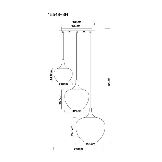 Ta čudovita viseča svetilka navdušuje z odličnim dizajnom. Iz okroglega stropnega nastavka štrlijo trije do 1,2 m dolgi kabli različnih dolžin do po ene vtičnice E27, ki so opremljeni z oblikovanimi steklenimi zasloni v barvi dima. Podnožje E27 vam omogoča, da sami določite barvo svetlobe in svetlost do največje moči 40 vatov. Zaradi dolge življenjske dobe in varčevanja z energijo priporočamo LED žarnice.
