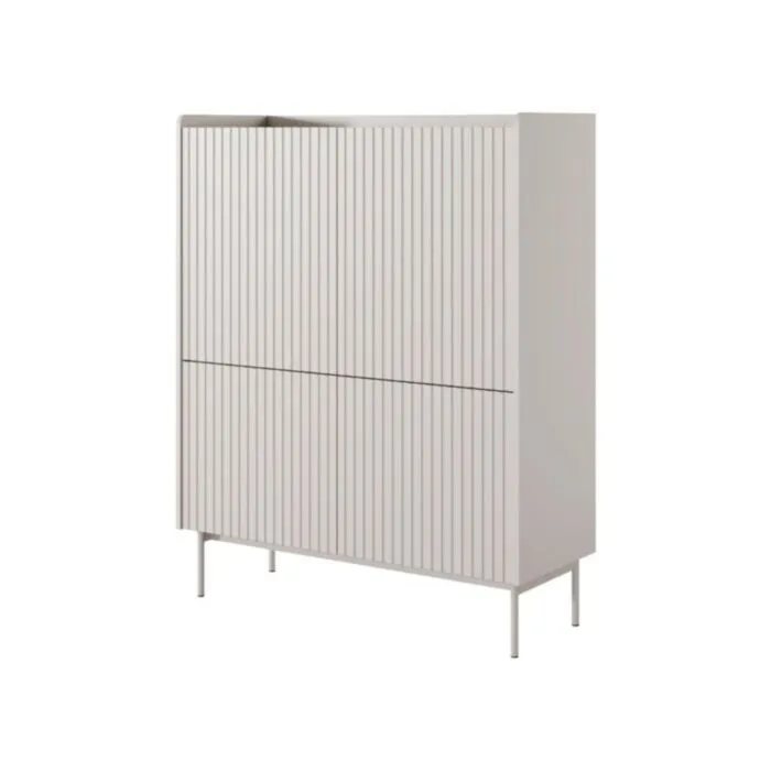 Visoka komoda LEVAS, je eleganten kos pohištva, ki popestri vaš prostor s svojim luksuznim dizajnom. Narejen je iz kakovostnih materialov v bež barvi s kombinacijo hrast. Izdelan je iz MDF-ja in ABS robov. Ima bež kovinske noge in mehko odpiranje. Ima rebrast dizajn, kar da posebno eleganco.