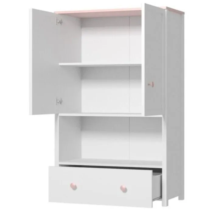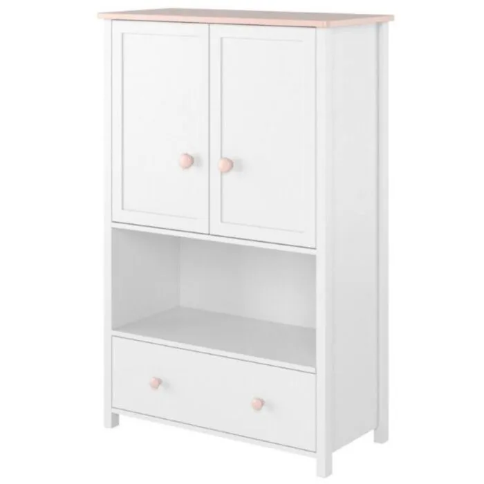 Visoka komoda LINA je eleganten predalnik z dvema vratama, polico za knjige ter prostoren in lahko dostopen predal.