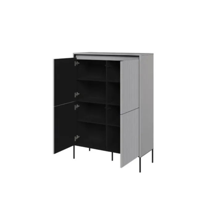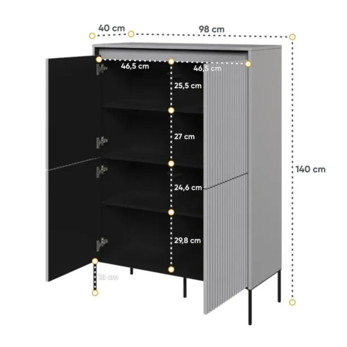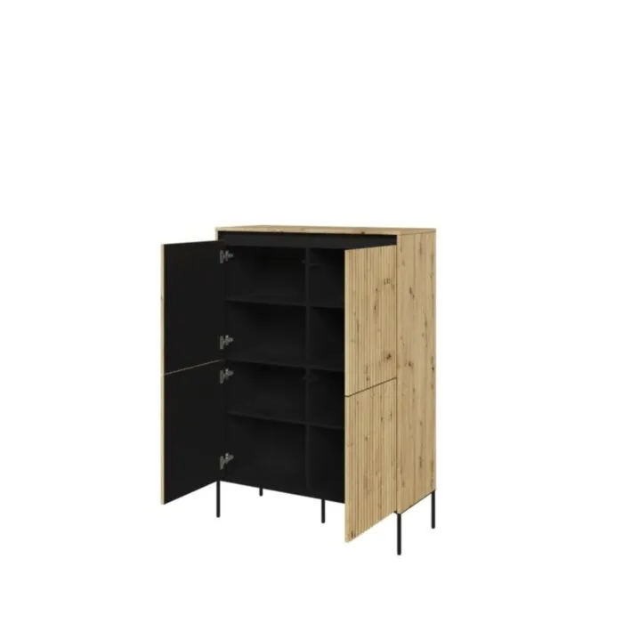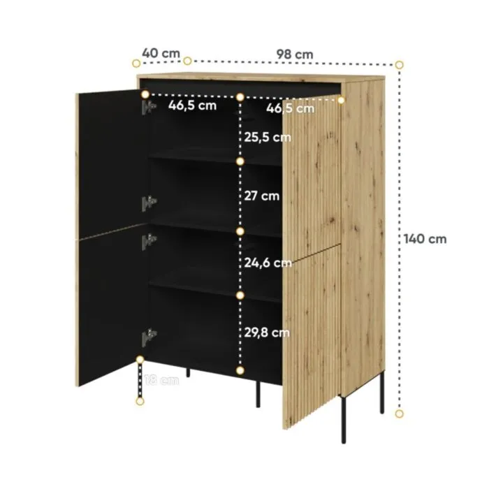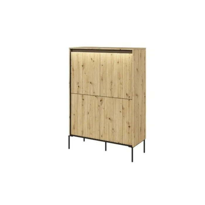 Visoka komoda TERA, ni le pohištvo, ki ponuja veliko prostora za shranjevanje, temveč vaši notranjosti doda tudi eleganco in slog. Visoka komoda ne bo le zadovoljila vaših potreb po shranjevanju, temveč bo postala tudi dizajnerski poudarek v vašem domu. Njena impresivna višina zagotavlja veliko prostora za shranjevanje različnih predmetov. Ne glede na to, ali potrebujete prostor za knjige, dokumente, oblačila ali okraske, vam bo naša komoda zagotovila veliko prostora, da bo vse lepo organizirano in enostavno dostopno. Opremljena je z LED osvetlitvijo, ki poudarja prostornost in eleganco dizajna. Na voljo je v dveh barvah: siva in hrast.