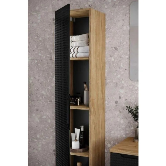 Kopalniški blok DIAMANT 120 črna je možno naročiti v kompletu (kopalniški bloki DIAMANT črna) ali pa po posameznih elementih po vaši izbiri. Visoka omara DIAMANT 35 črna je modernega dizajna. V kombinaciji črne in pridihom hrast barve daje eleganten videz.  Izdelan je iz laminirane ter MDF plošče. Vsebuje mehko zapiranje.