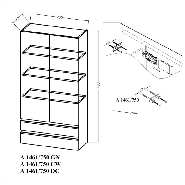 Z dimenzijami širine 750 mm, višine 1460 mm in globine 320 mm je ta dvokrilna garderoba s predali posebej primerna za večje kopalnice.