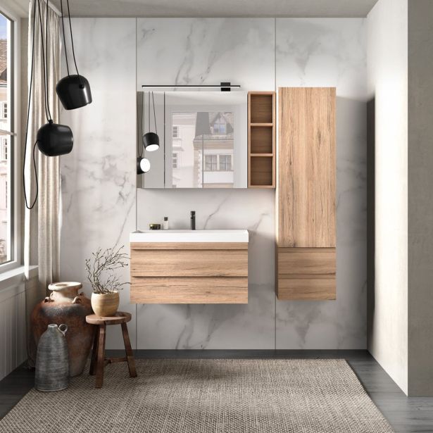 Viseča omarica v narvni barvi lesa je estetska klasika, ki nikogar ne pusti ravnodušnega, dotik rustikalnega vpelje v sicer umirjeno, sodobno dizajnersko noto.